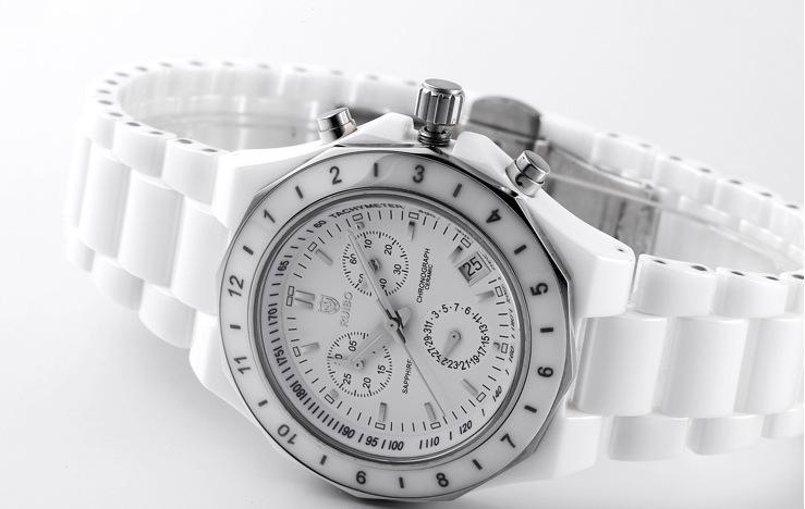 陶瓷手表与不锈钢材料的手表相比,陶瓷手表的重量减轻了大约60%,其硬度约为不锈钢材料的10倍,而且耐锈蚀和耐热性能好,具有高硬度,不易磨损,永不退色,不损肌肤的优点。